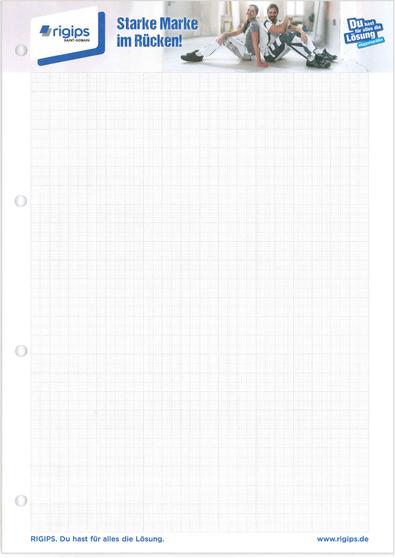 Rigips Schreibblock im A4 Format. Millimeterpapier. Papier Offset weiß 80 g/m² holzfrei glatt geschnitten, 30 Blatt je Block, am Kopf verleimt. Graupappe als Unterkarton.